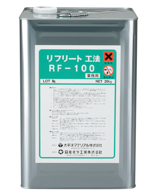 - 「RF-100」は、素地強化機能を有するケイ酸リチウム系アルカリ性付与材で、中性化ならびに表層劣化したコンクリート素地面に塗布含浸させることによって、コンクリート表面強度を増進させるとともにアルカリ性を付与し、アルカリ環境雰囲気にします。「RF-100」の塗布量は、200~400g/㎡で、コンクリート表層の劣化状況によって変動します。
