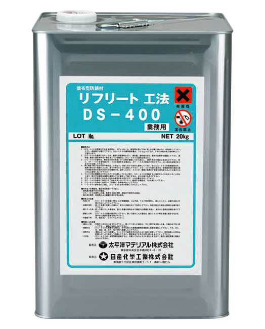 - 「DS-400」は、亜硝酸リチウムを主成分とした塗布形防錆材で、コンクリート素地に塗布することにで、防錆成分がコンクリート中に浸透・拡散し、鉄筋表面に緻密な被膜(不働態被膜)を形成し、鉄筋の腐食を抑止します。
