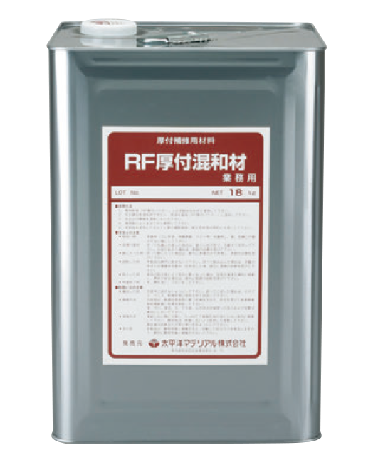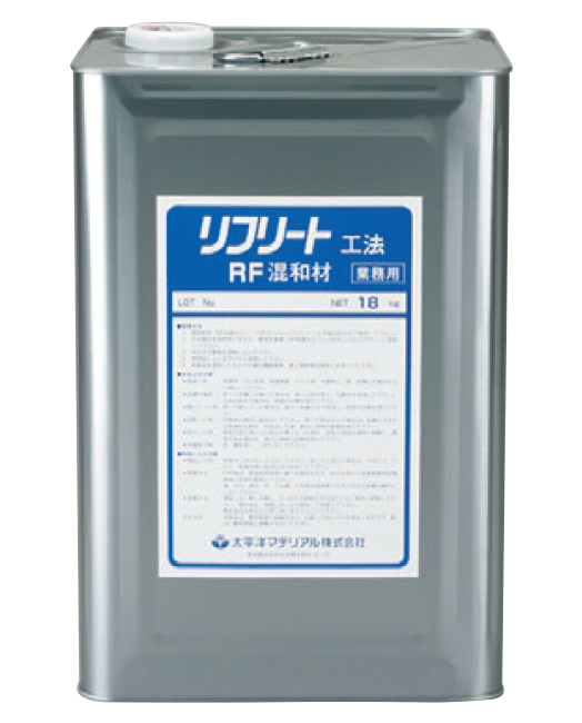- 「RF混和材」は、亜硝酸カルシュウム系防錆材を混入したSBR系ラテックスで、「RF防錆ペースト」および「RFモルタル」専用の混和材です。