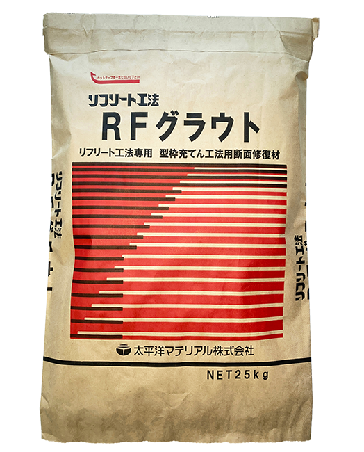 - 「RFグラウト」は、「RF混和材」を用いて練り混ぜる型枠充てん工法用断面修復材です。ポリマー、鉄筋防錆剤および特殊混和材の作用による鉄筋腐食への耐性(耐塩害性)、独自の配合設計による「スムーズな充てん性能」、「寸法安定性能」および「温度ひび割れの発生抑制性能」を有します。